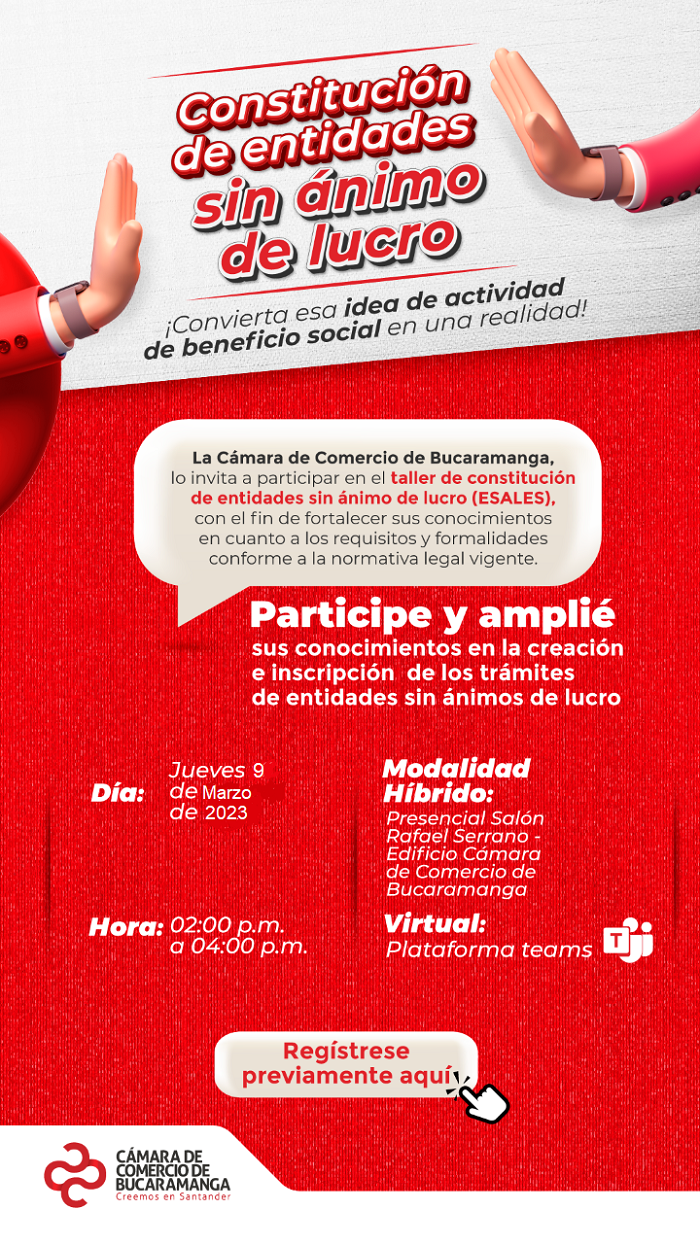 La Cámara de Comercio de Bucaramanga, lo invita a participar en el taller de constitución de entidades sin ánimo de lucro (ESALES), con el fin de fortalecer sus conocimientos en cuanto a los requisitos y formalidades conforme a la normativa legal vigente. Participe y amplié sus conocimientos en la creación e inscripción de los trámites de entidades sin ánimos de lucro